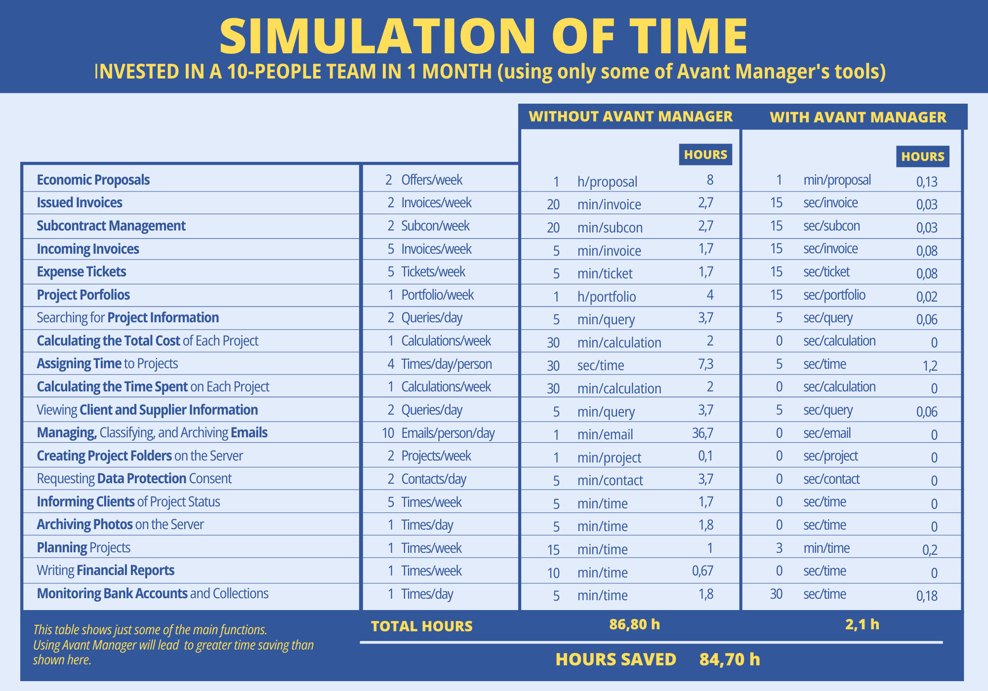 A cloud-based software that won’t require you to change anything in your IT system and is paid for monthly, with no initial investment and no commitment. With Avant Manager, you’ll increase your team’s productive capacity without having to pay more salaries.
