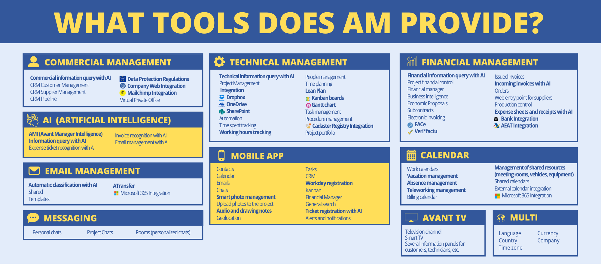 It offers you the ability to perform complex and customized queries on the Avant Manager database and obtain detailed answers, data analysis, comparison tables, and more. It also helps you with tasks such as recording an incoming invoice or expense report, applying AI to recognize the data in these documents and automatically filling in the corresponding fields so you can record them in Avant Manager. It also helps you automatically classify the emails you receive, the photos you take from the mobile app, and so on…