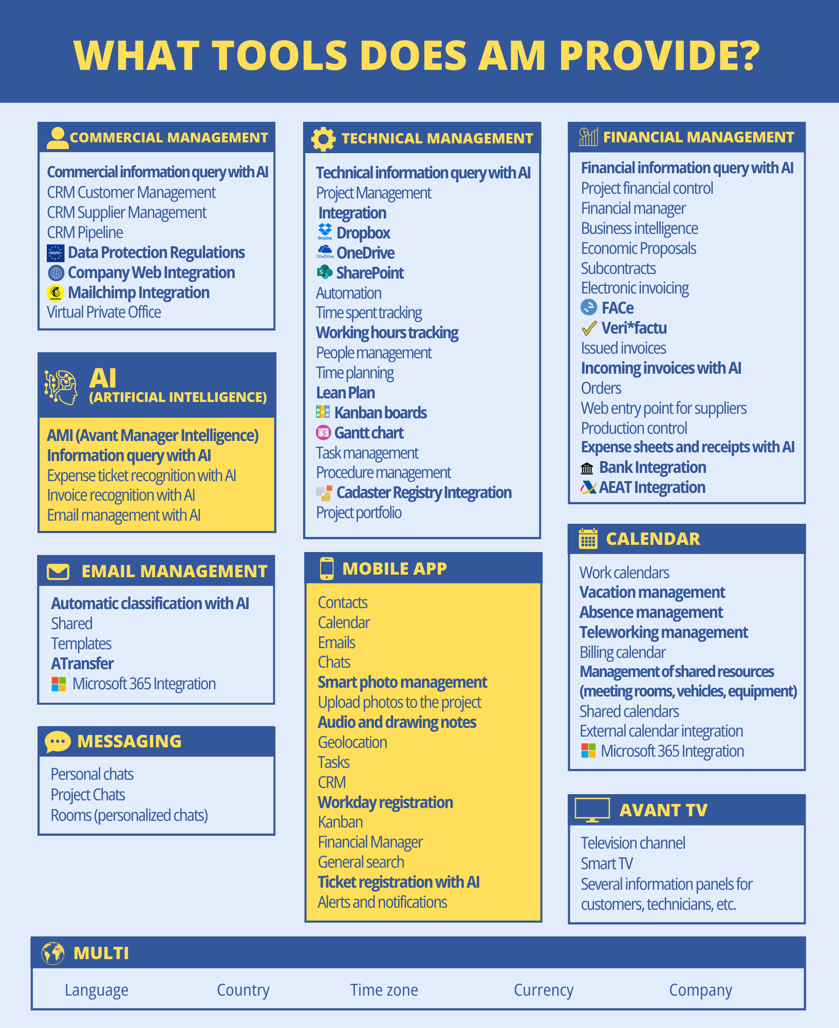 Avant Manager is multilingual, both in its user interface and in all the documents it generates, including economic proposals, invoices, orders, portfolios, emails, etc.